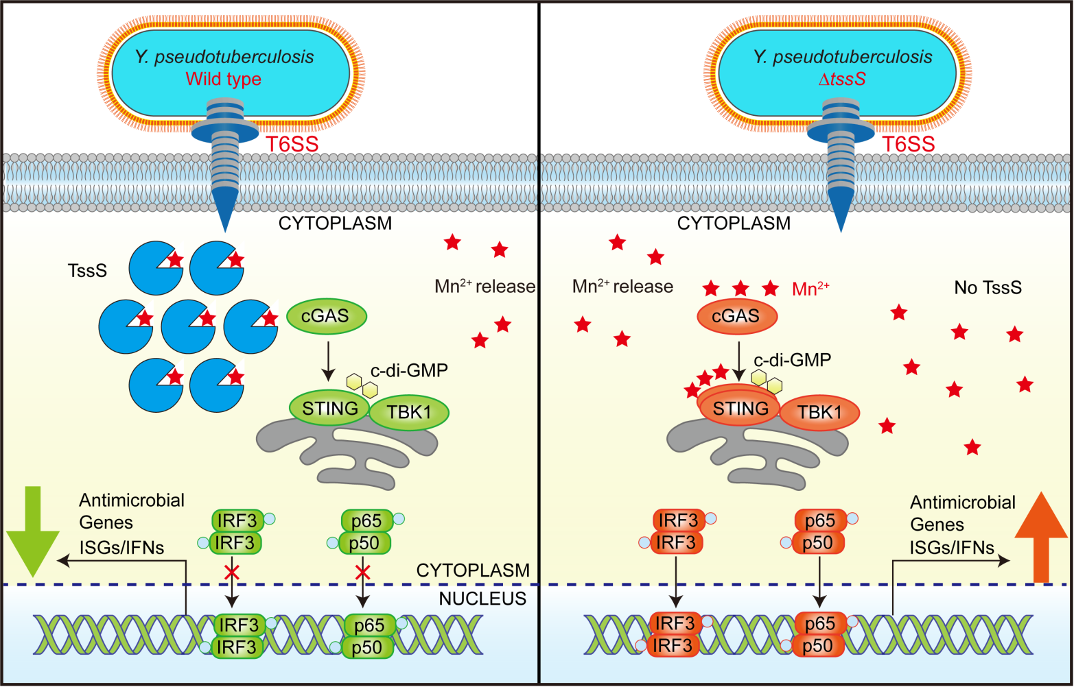 本研究发现革兰氏阴性菌假结核耶尔森氏菌(Y. pseudotuberculosis,Yptb)T6SS可分泌一个仅由48个氨基酸组成的锰离子结合蛋白TssS(T6SS-secreted micropeptide suppressing STING)促进细菌对锰离子的摄取。该基因缺失的突变体菌株(ΔtssS)对小鼠致病性显著下降,感染ΔtssS菌株小鼠的不同组织器官内细菌载量也明显下降。转录组学分析发现,与感染野生型菌株相比,感染ΔtssS菌株细胞内的I-型干扰素(Type I-IFNs)及干扰素刺激基因(IFN-stimulatedgenes, ISGs)表达明显上升,提示TssS能够抑制宿主抗细菌天然免疫反应;而将TssS中锰离子结合位点突变后,其对天然免疫系统的抑制能力和对小鼠的致病性显著下降,说明TssS的锰离子结合能力对其抑制天然免疫至关重要。进一步研究发现LPS(革兰氏阴性菌细胞壁组分)处理能显著升高细胞质锰离子浓度,但在细胞中过表达TssS蛋白则能够抑制cGAMP/c-di-GMP所诱导的STING活化和下游基因表达。假结核耶尔森氏菌(Yptb)及同属的鼠疫杆菌(Y. pestis)和小肠结肠炎耶尔森菌(Y.enterocolitica)都产生对其存活、侵染非常重要的第二信使c-di-GMP。以往的研究表明锰离子可显著促进c-di-GMP与STING的结合。与此相一致,野生型Yptb或ΔtssS突变体感染野生型小鼠后,Yptb野生型感染的小鼠中细菌载量显著高于ΔtssS感染小鼠;而当这两种菌株分别感染STING缺失小鼠时,不同感染组之间细菌载量的巨大差异显著缩小。这些结果表明:一方面细菌产物LPS和c-di-GMP分别诱导宿主细胞内锰离子释放并共同促进STING活化;另一方面细菌产生并分泌TssS通过螯合胞内锰离子以削弱c-di-GMP对STING的结合及激活能力,实现对宿主抗细菌天然免疫反应的抑制。