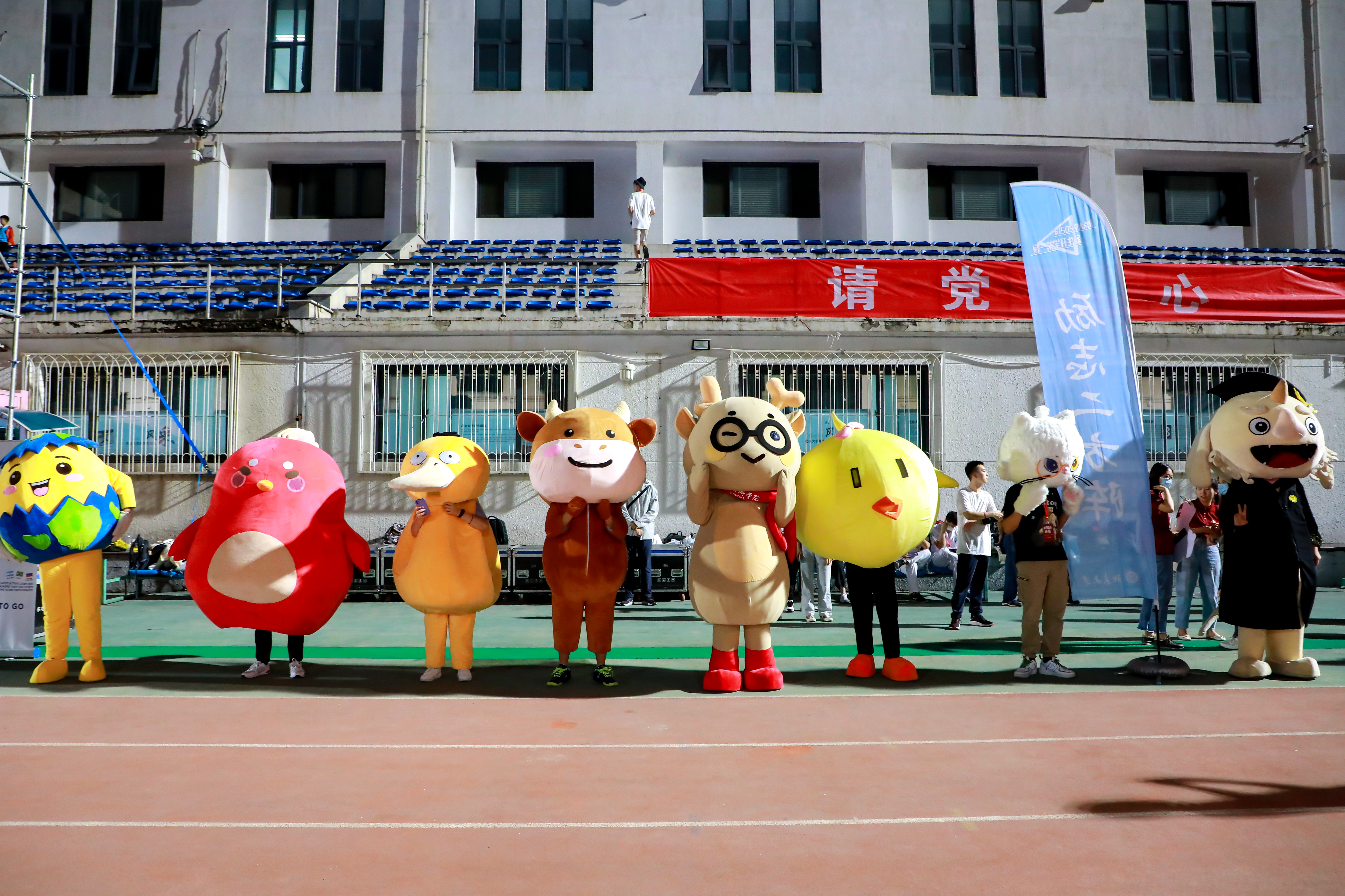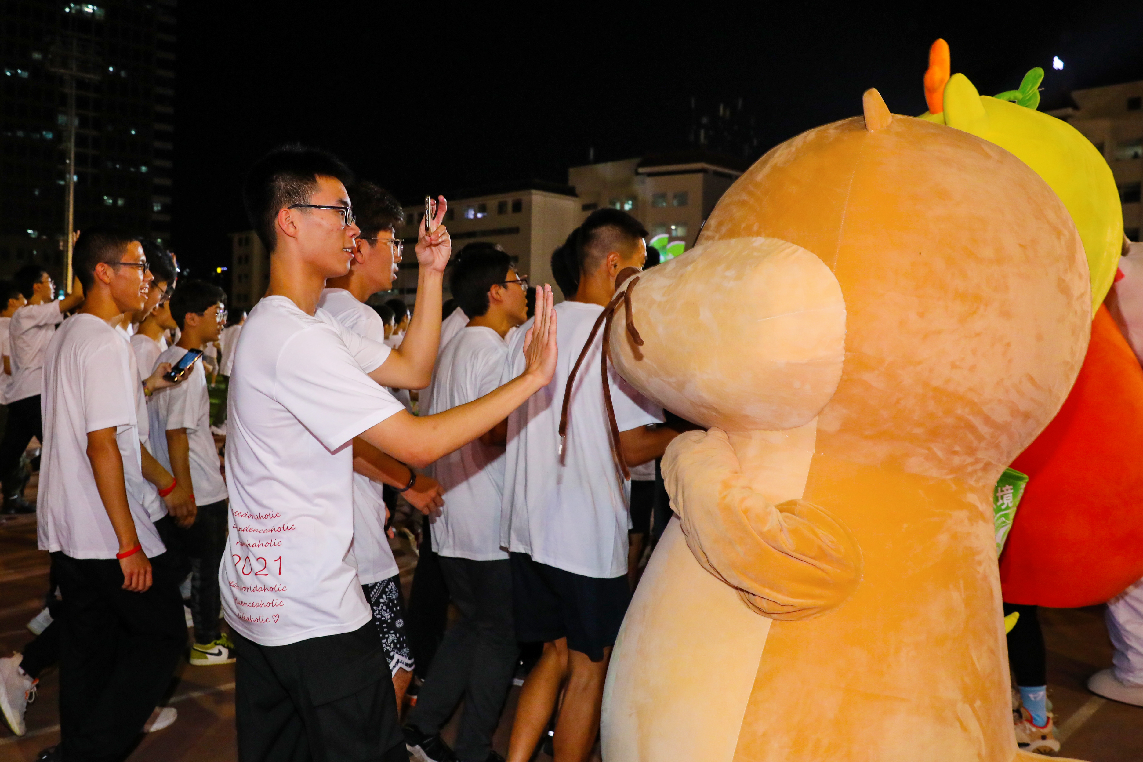 从快走到慢跑,方阵跑动的速度逐渐加快。在活力四射的音乐声中,同学们挥洒着青春的汗水,也感受着北大的人文关怀——在主席台下的跑道外侧,各个院系的吉祥物为经过的师生加油打气;尽管参与夜跑的师生人数众多,但领跑员们合理地掌控着行进节奏,现场秩序热烈而有序。