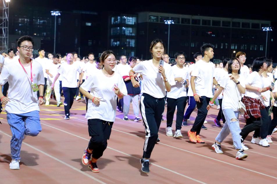 音乐响起,极具动感的乐声伴随着炫目的灯光飞扬在五四体育场的上空。现场师生进行着跑前热身活动,热身不仅有个人的肢体伸展,也有与周围同学的合作环节。在逐渐升温的气氛中,同学们与身边的伙伴更加亲近。