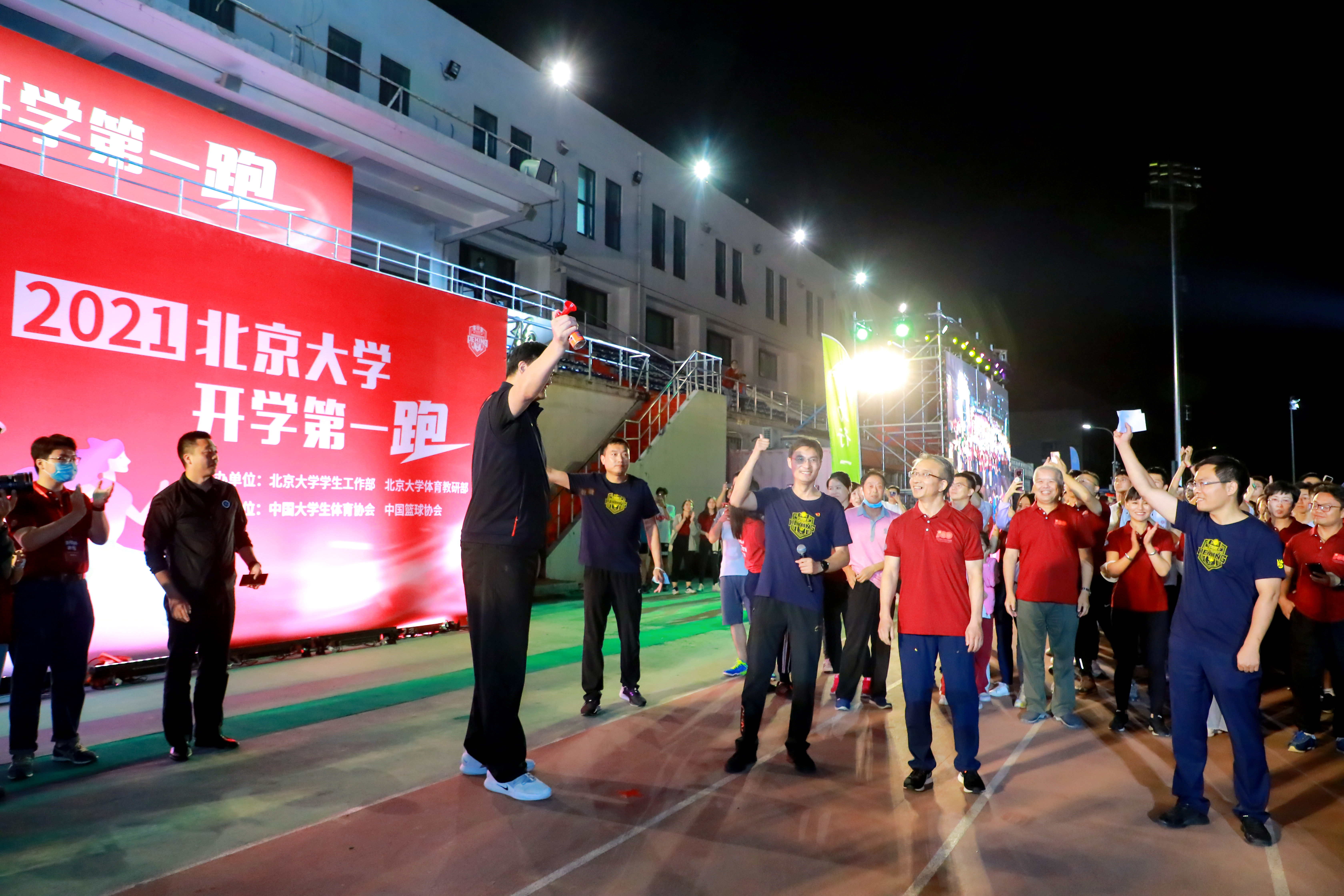 2021年9月6日,初秋的北大五四体育场灯火通明、“热浪袭人”——全校近30个院系的领导老师和全体本科新生聚集在五四体育场,共同参加北京大学“开学第一跑”活动。和同学们共同奔跑的有北京大学校长、中国大学生体育协会主席郝平,常务副校长、教务长龚旗煌,常务副校长、医学部主任乔杰,党委副书记安钰峰,党委副书记、纪委书记叶静漪,党委副书记、副校长陈宝剑等校领导。本次活动还邀请到中国篮球协会主席姚明,教育部学生体育协会联合秘书处秘书长、中国大学生体育协会副主席薛彦青,教育部学生体育协会联合秘书处副秘书长、中国大学生体育协会副主席、秘书长张爱龙等嘉宾莅临现场。