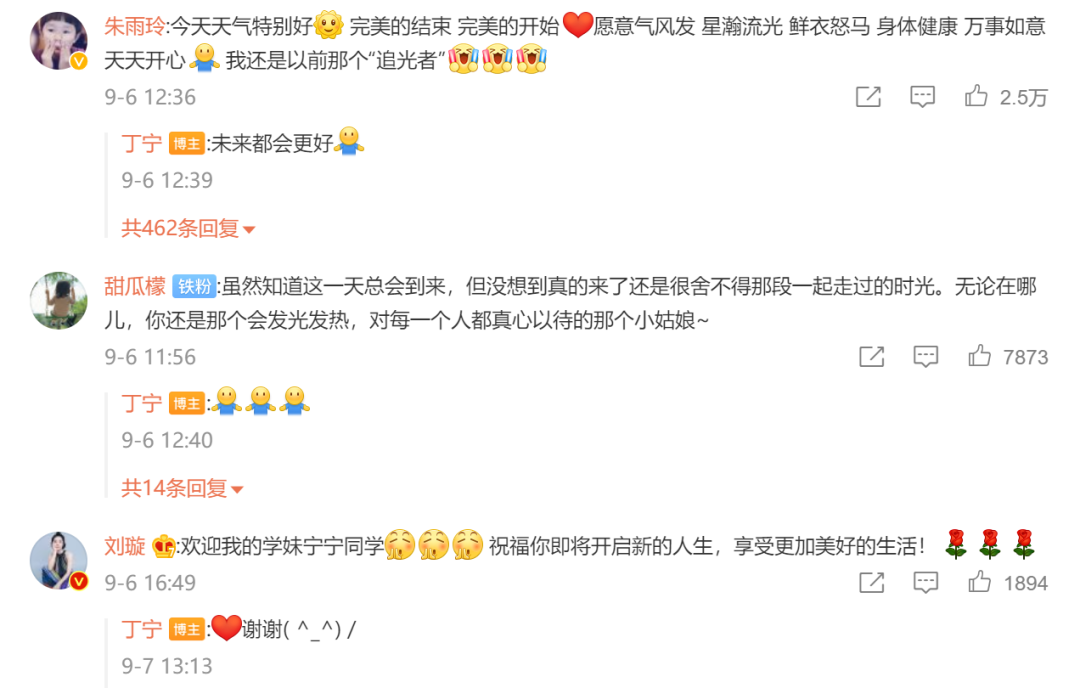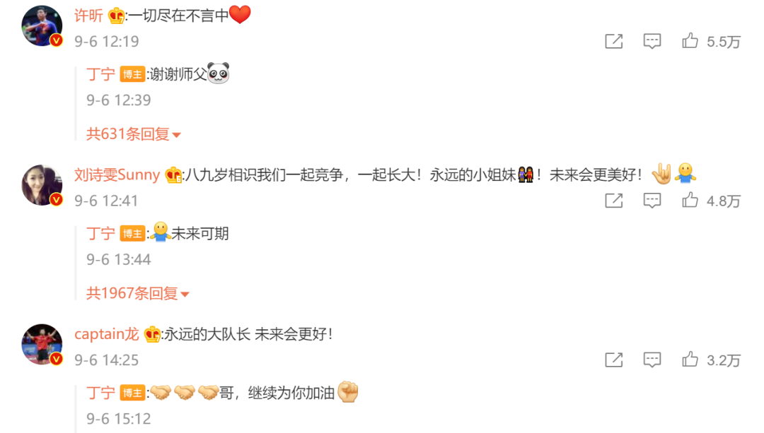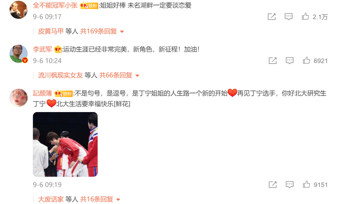 马龙、许昕、刘诗雯、朱雨玲等一众队友,在她的微博下留下祝福。北大学姐、体操奥运冠军刘璇,向她发来祝贺。无数球迷、粉丝,写下许多深情的话。快乐、美好、开心,是被提及最多的字眼。看上去,等待着“学习宁”的,是一片灿烂坦途。