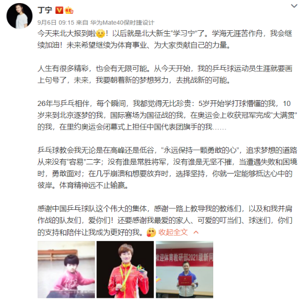 宣布退役时,丁宁在微博上晒出了三张个人照,影像里分别是不同年龄的自己。