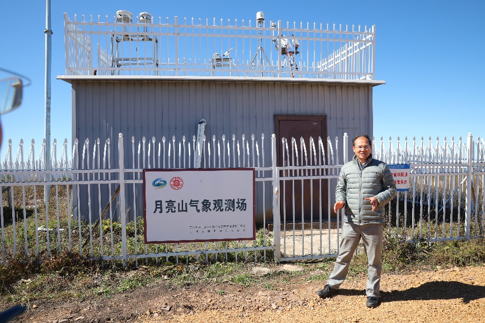 郑成洋讲解月亮山气象观测场的观测项目和建设情况