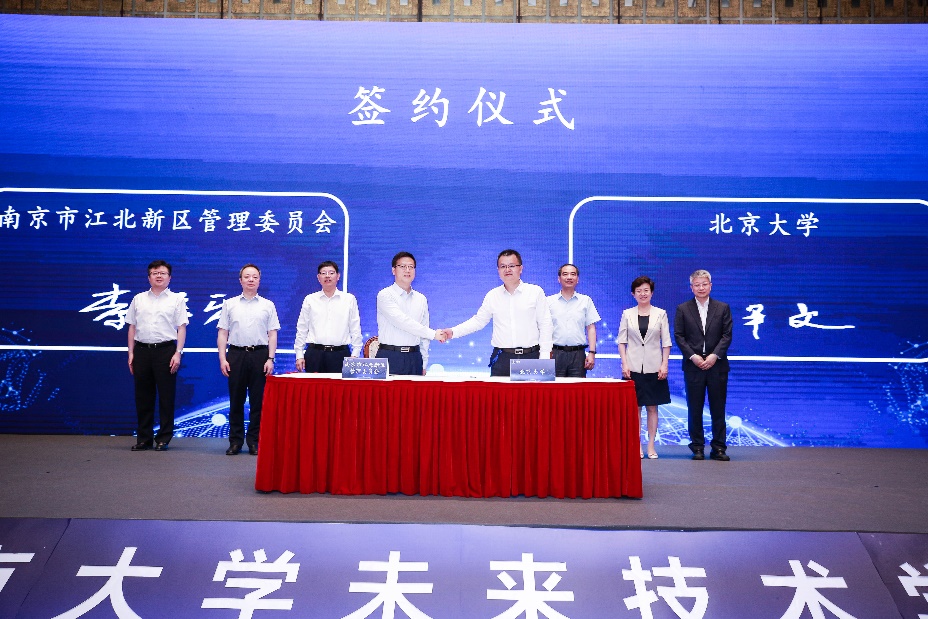 在龚旗煌、乔杰、程和平、罗群、江北新区产业技术研创园管理办主任蒋华荣和生命健康产业发展管理办主任陈洪的见证下,张平文和南京市江北新区党工委委员、管委会副主任李保平签署《北京大学-南京市江北新区管理委员深化合作意向书》。