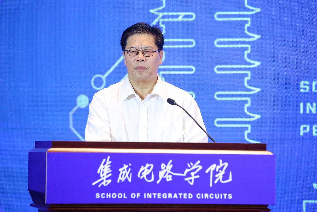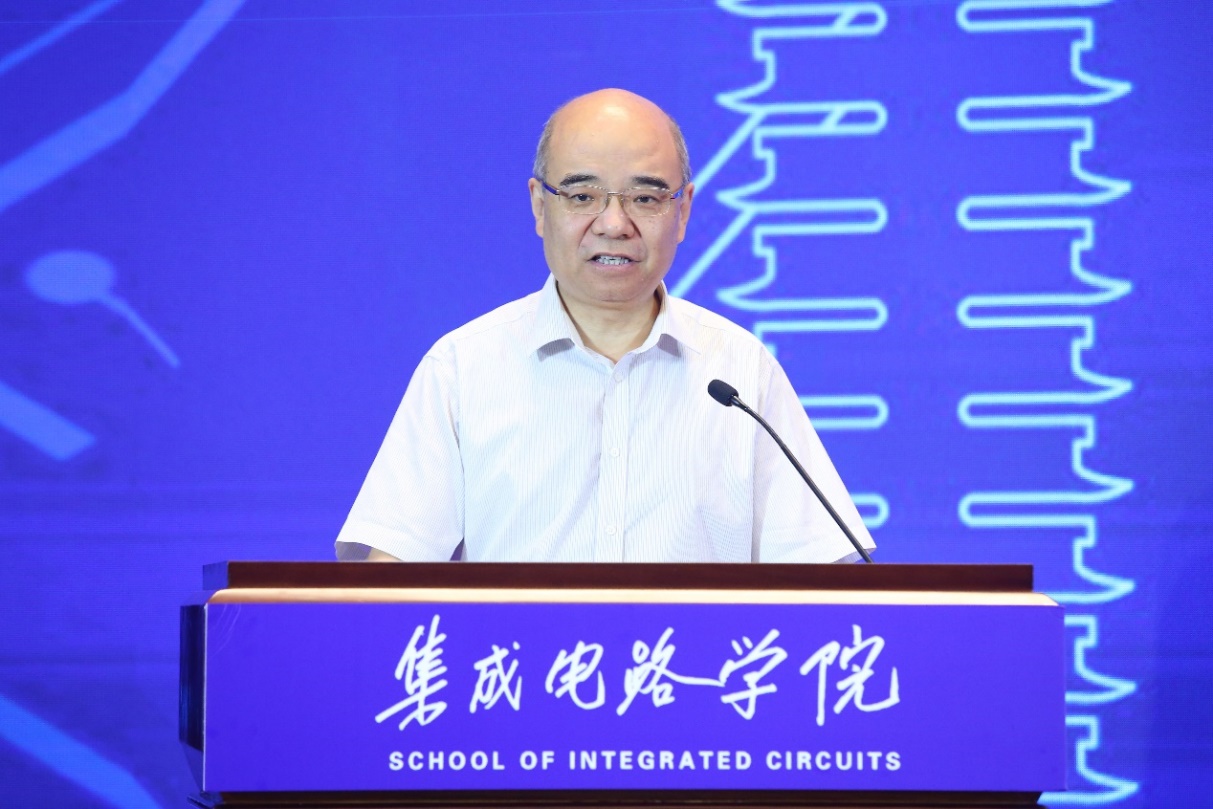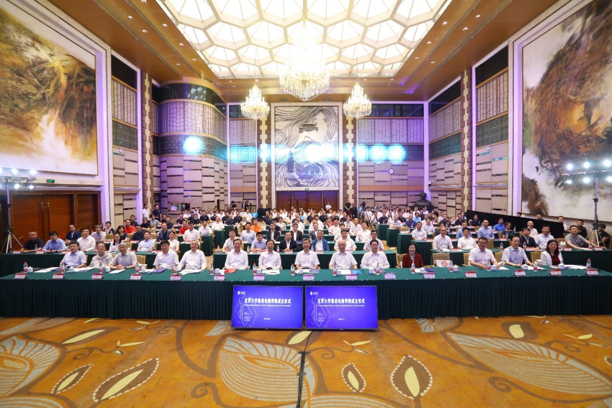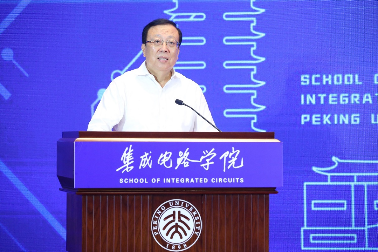 7月15日上午,北京大学集成电路学院成立仪式在英杰交流中心阳光大厅举行。中国科学技术协会党组书记、常务副主席、书记处第一书记怀进鹏院士,科学技术部党组成员、副部长相里斌院士,工业和信息化部党组成员、副部长王志军,国家自然科学基金委员会副主任谢心澄院士,北京市科学技术委员会主任许强,北京大学党委书记邱水平,校长郝平,副校长张平文院士,副校长黄如院士,校长助理、秘书长孙庆伟,杨芙清院士,王阳元院士,郑南宁院士,夏建白院士,郝跃院士,王恩东院士,俞大鹏院士,徐红星院士,吴汉明院士,张跃院士,罗先刚院士等出席会议。在京兄弟院校专家学者、企业代表、校友代表、学校相关职能部门负责人、学院师生代表200余人参加会议。成立仪式由黄如主持。