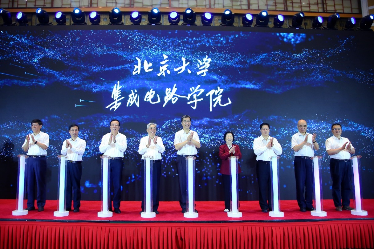 怀进鹏、相里斌、王志军、邱水平、郝平、杨芙清、王阳元、许强、张平文共同为北京大学集成电路学院揭牌。