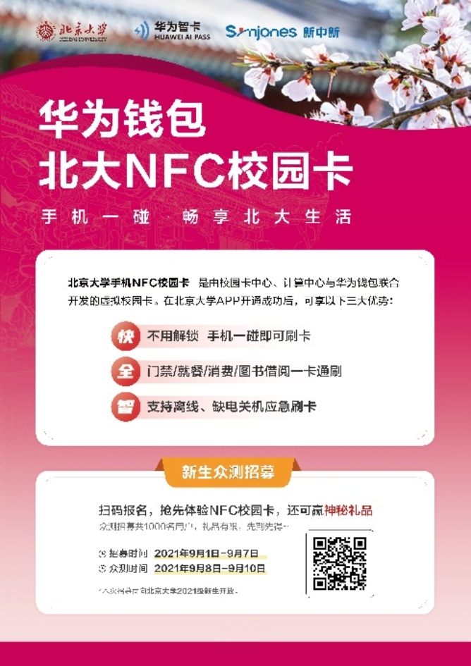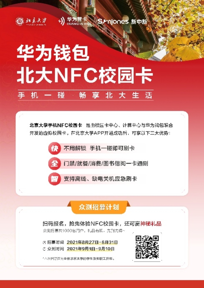 由于NFC校园卡功能需要手机系统支持,本次新建设的NFC校园卡服务将首选华为手机开展,通过华为钱包满足校园中约2万部华为手机的刷卡使用。学校将于9月1日同步推出华为手机北大NFC校园卡众测启动计划,以及新生NFC校园卡众测招募计划,欢迎大家参加测试。