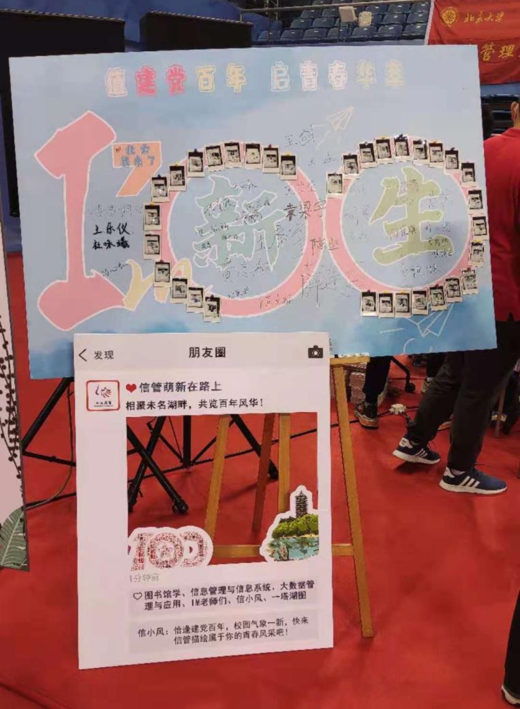 “值建党百年,启青春华章。”信息管理系在接待站前的迎新展板上用新生照片拼出了大大的“100”字样,向党的百年华诞献礼。