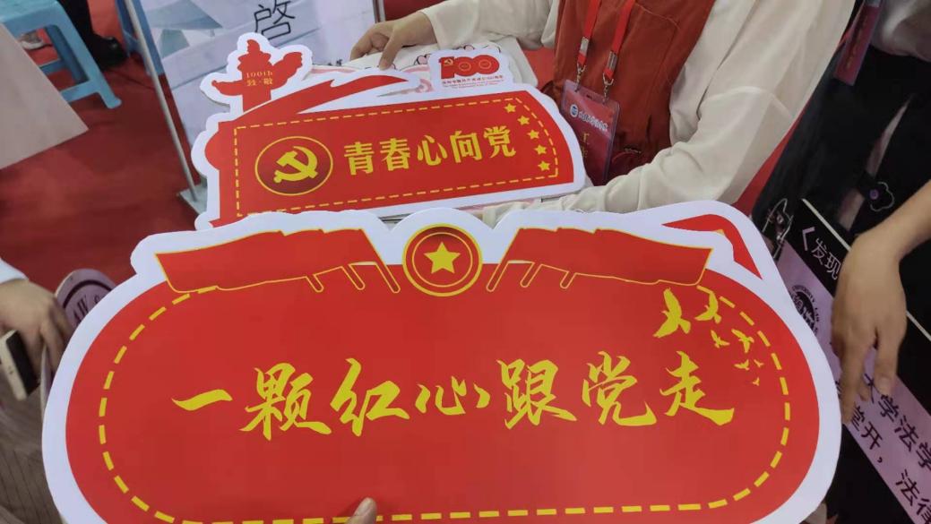 法学院在拍照小标板上下了功夫。“青春心向党”“一颗红心跟党走”“建功新时代”……带着党徽和庆祝建党百年主题logo的小标板把新生们的脸映衬得红扑扑的。