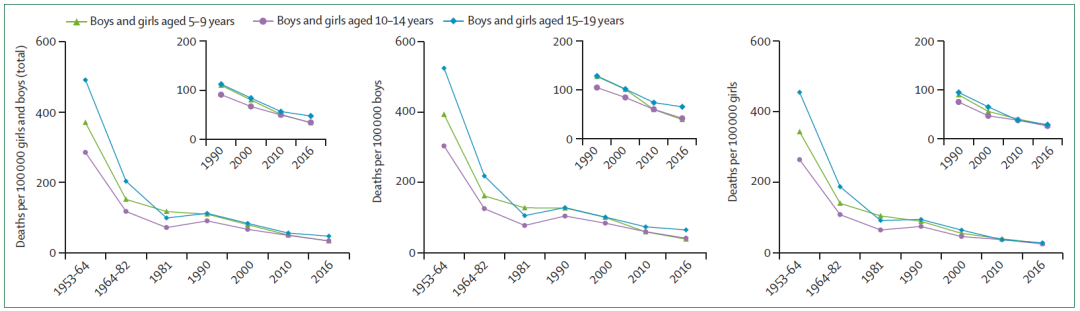 图2|5-19岁儿童青少年死亡率快速下降、性别差距缩小(1953-2016年)