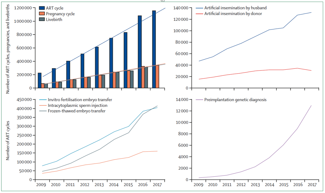 图6|中国辅助生殖技术治疗周期数及生育结局(2009-2017年)