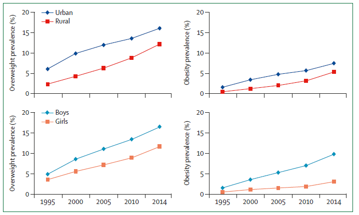 图8|中国学龄儿童及青少年城乡地区及不同性别的超重率(1995-2014)
