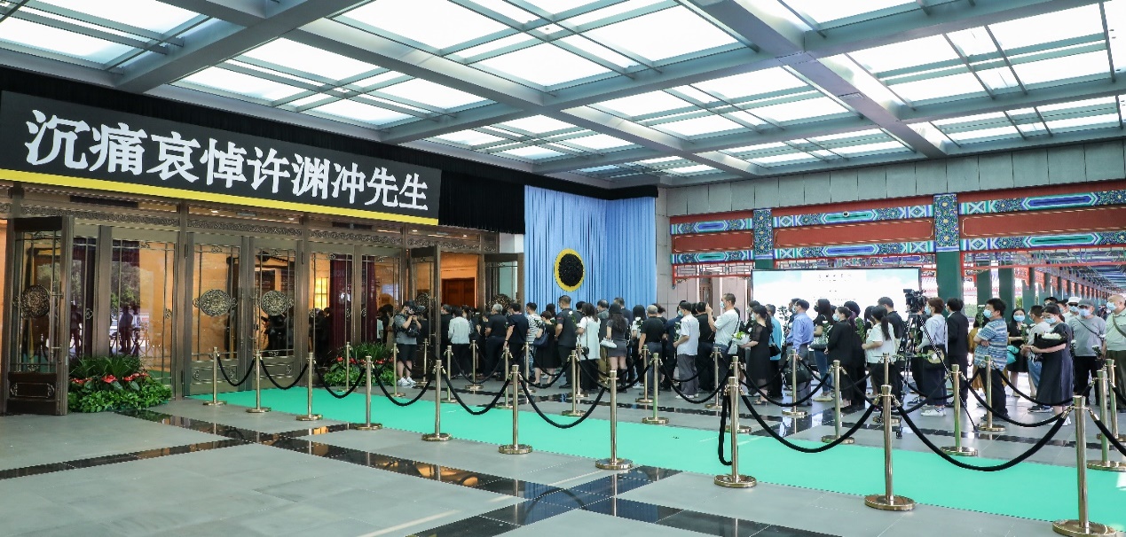 当天清晨,八宝山殡仪馆告别大厅外的走廊里站满了从各地赶来的人们。他们手持白菊,排队次第进入礼堂,送别许先生。