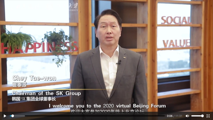 韩国SK集团全球董事长、北京论坛高端顾问委员会委员崔泰源在视频中指出,为解决人类面临的最大挑战之一——环境问题,我们必须团结起来,进行全球性响应。世界各国已就此开展了广泛的国际合作,但仍有诸多环境与社会问题亟待解决。对于如何改变人类行为,他从企业家角度出发,提出要改善企业战略,创造更多社会价值;完善监督体系,建立良好的市场环境;提高“同理心”,理解和分享他人感受。他希望本届北京论坛能够为解决环境问题带来引导与启发。