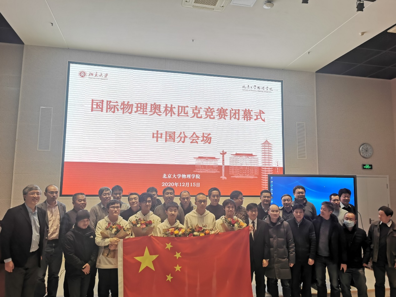 北京时间2020年12月15日晚,2020年度国际物理奥林匹克竞赛(International Distributed Physics Olympiad, IdPhO2020)闭幕。中国代表队的五位选手张意飞、孙睿、李世昌、韩永琰和欧阳霄宇全部以高于金牌分数线50%以上的突出成绩夺得金牌并包揽前五名;张意飞更以超优异表现勇夺最佳总成绩奖、最佳理论奖、最佳实验奖。北京大学物理学院穆良柱、荀坤副教授担任中国队领队,陈晓林、李智、陈志坚教授出任观察员。