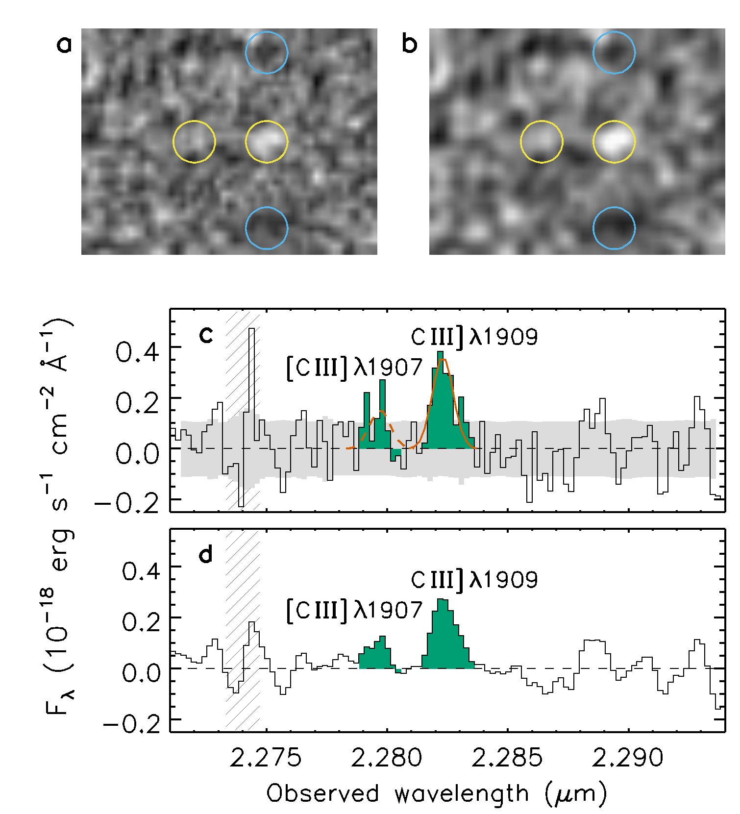 图2. 星系GN-z11的部分光谱。其中图a)和c)分别是二维和一维光谱,图b)和d)分别是相应的平滑后光谱。图中显示,二次电离碳位于静止波长191纳米左右的发射线,已经移至2283纳米左右,表明其红移为10.957,即距离在134亿光年外