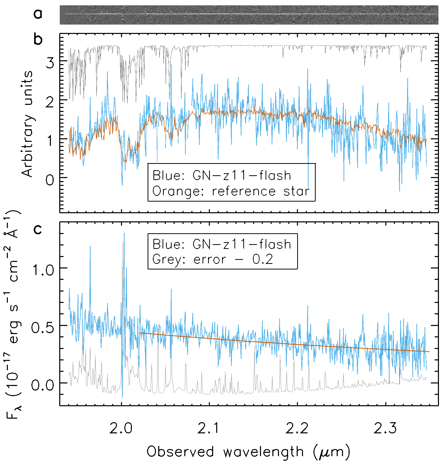 该研究团队在观测GN-z11的光谱时,还探测到来自该星系方向的一次爆发。该爆发表现为一明亮的近红外光谱,持续时间短于三分钟(图3)。这是一次低概率事件。光谱包含明显的大气吸收成分,表明爆发信号来自地球大气层外。经详细分析,基本排除该爆发信号来自地球上人造物体和太阳系天体等来源。进一步理论计算表明,该光谱可能来自GN-z11的一次伽马射线暴,为伴随该伽马射线暴的(静止坐标下)紫外辐射。遗憾的是,在观测时段内现有伽马射线卫星没有观测该天区或探测深度不够。尽管在观测时段内GN-z11发生伽马射线暴的概率极低,但仍远高于来自其它已知信号源的概率。若伽马射线暴解释成立,那么这是目前人类已知的最遥远天体爆发,表明宇宙大爆炸后4亿年左右宇宙就可能大量产生伽马射线暴。