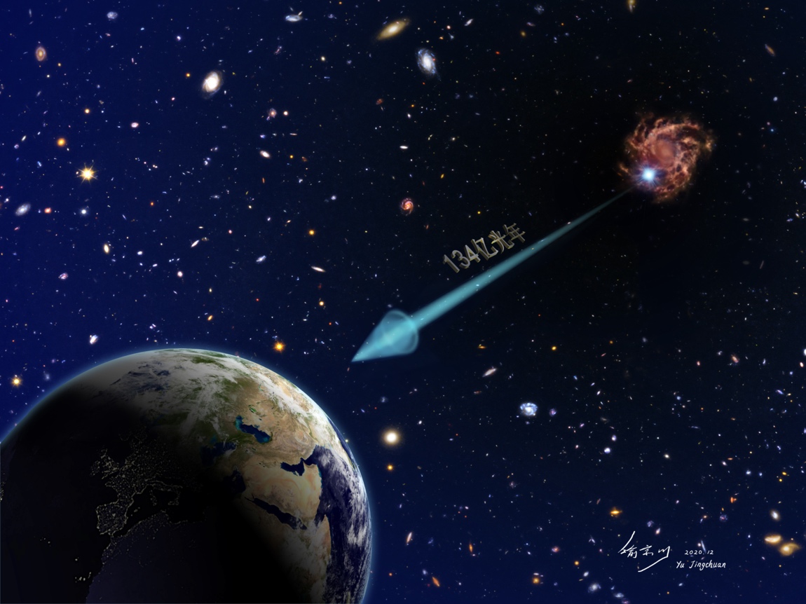 艺术想象图-北大学者领衔团队证实134亿光年之外存在的最遥远星系及其中疑似伽马射线暴(图片制作:北京天文馆喻京川)