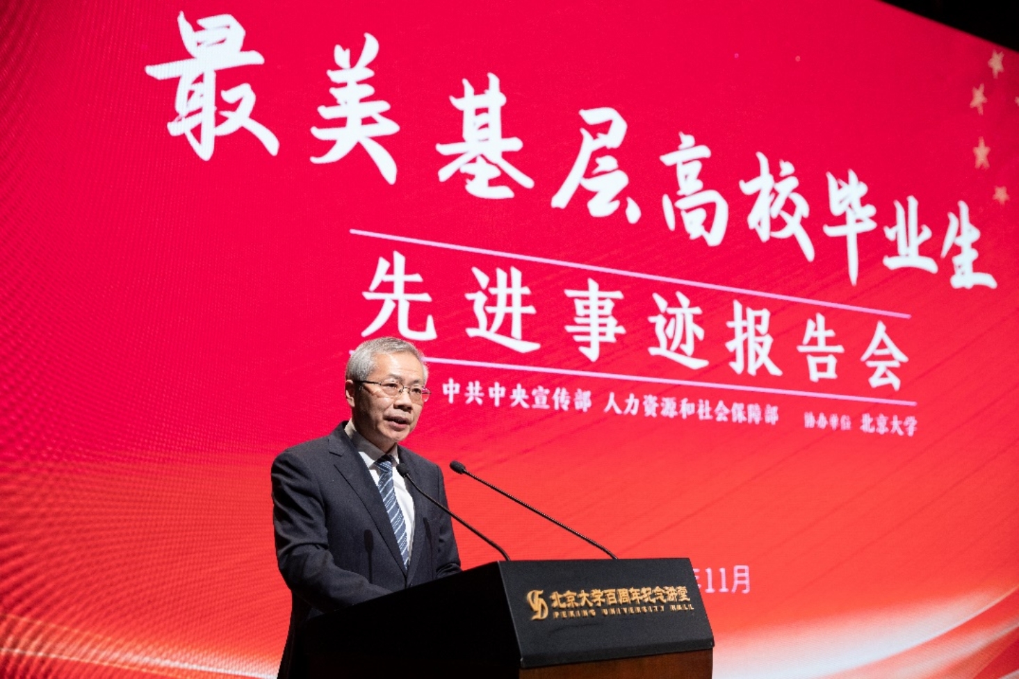 11月17日,由中央宣传部、人力资源和社会保障部联合举办的“最美基层高校毕业生”首场先进事迹报告会在北京大学百周年纪念讲堂举行。人力资源和社会保障部党组成员、副部长汤涛出席并讲话,北京大学党委副书记、副校长陈宝剑出席活动并会见宣讲团一行。报告会由中央宣传部宣教局副局长冷志明主持。