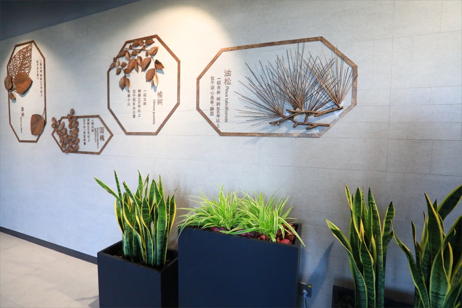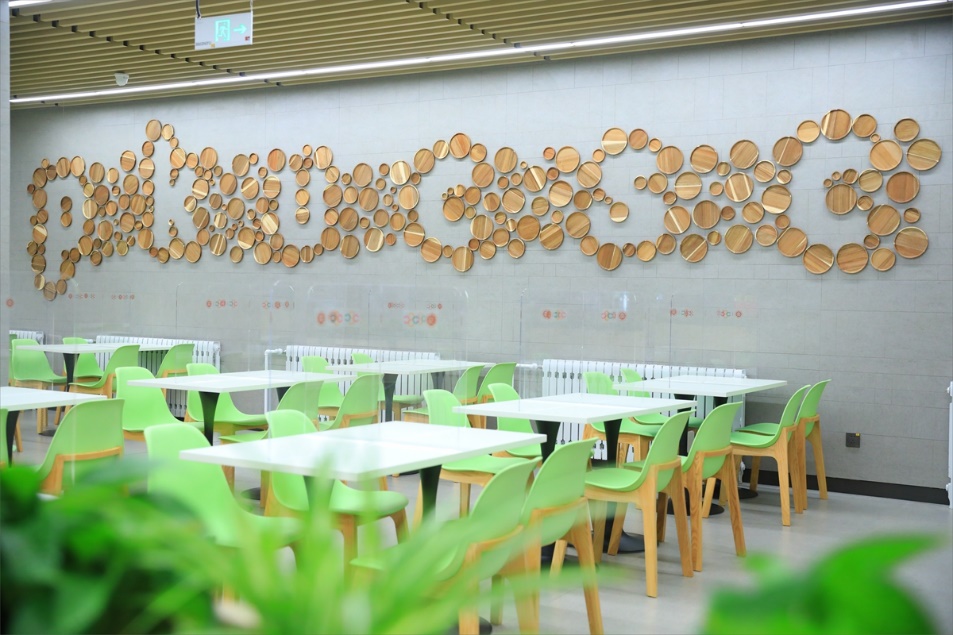 即使在室内,仔细留心也会发现“风景”无处不在,充满北大元素,韵味十足。东门入口处,银杏、国槐、桧柏、白皮松、油松、榆树、桑树、七叶树等八种北大古老树种的树叶装饰品,精致而立体地呈现在墙面上,栩栩如生,寓意“立德树人”。在三层露台的通道上,一对以“味道”为主题的装饰画格外醒目。“我心里的燕园味道”与“记忆中的家园味道”遥相呼应,寄托希望同学们在家园食堂找到家的感觉与味道的深刻寓意。三层活动空间一旁,一面墙栽满鸭脚木、万年青、黄金葛、袖珍椰子、美丽竹芋等植物,净化空气的同时,也净化了师生的心灵……