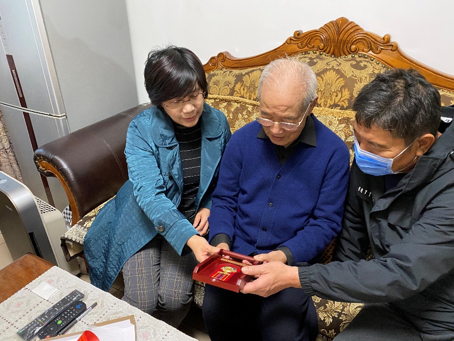 近日,学校相关部门院系也陆续对纪念章获得者展开走访慰问。北大青鸟集团党委上门拜访了本单位参加抗美援朝出国作战的吴凤林、吴再泉二位老同志,并为他们佩戴了纪念章。