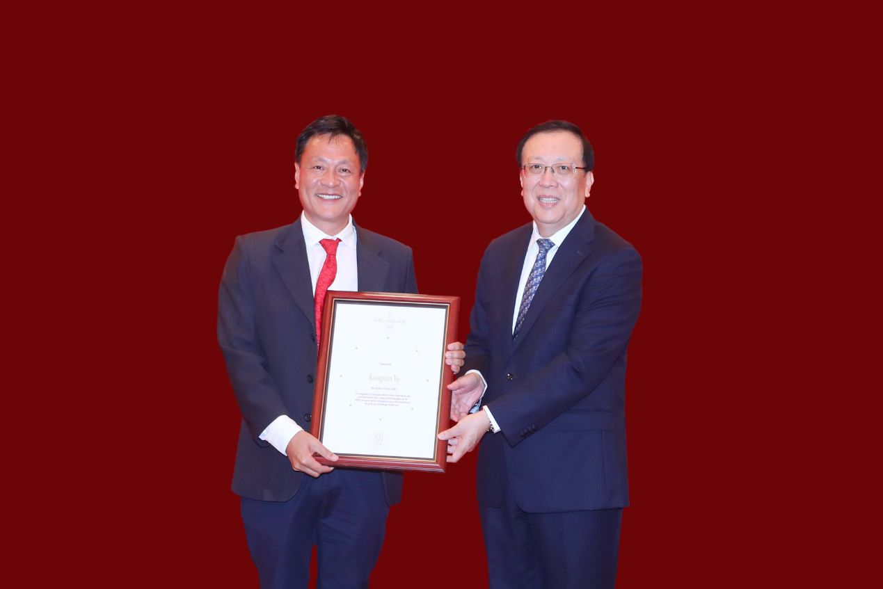 北京时间10月8日20时,世界景观设计师与风景园林联合会(IFLA)杰弗里·杰里科爵士奖(Sir Geoffrey Jellicoe Award)颁奖典礼以线上线下结合方式举行。北京大学教授俞孔坚荣获2020年杰弗里·杰里科爵士奖。北京大学在英杰交流中心月光厅设立分会场。受世界景观设计师与风景园林联合会委托,校长郝平出席颁奖典礼并为俞孔坚颁奖。副校长黄如,城市与环境学院院长贺灿飞、艺术学院院长彭锋及相关职能部门负责人参加典礼。
