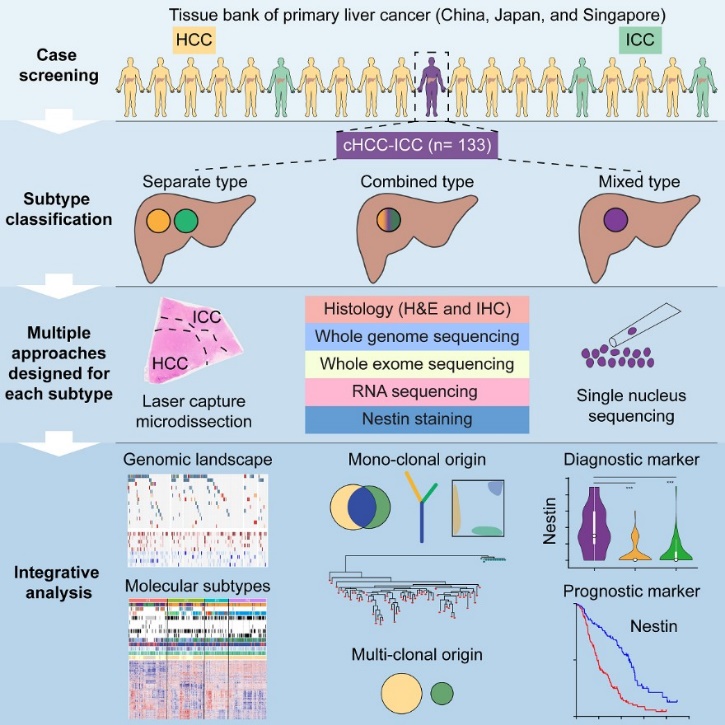 研究提出了混合型肝癌分子分型标准,揭示了混合型肝癌中肝细胞癌和胆管细胞癌两种成分的克隆起源关系,发现Nestin蛋白表达可以作为混合型肝癌的诊断和预后标志物,这些结果为混合型肝癌的临床诊断、预后和治疗提供了关键信息。上述工作于2019年5月23日发表在Cancer Cell,张宁、白凡、曾木圣为通讯作者,该论文获评细胞出版社2019中国年度论文。