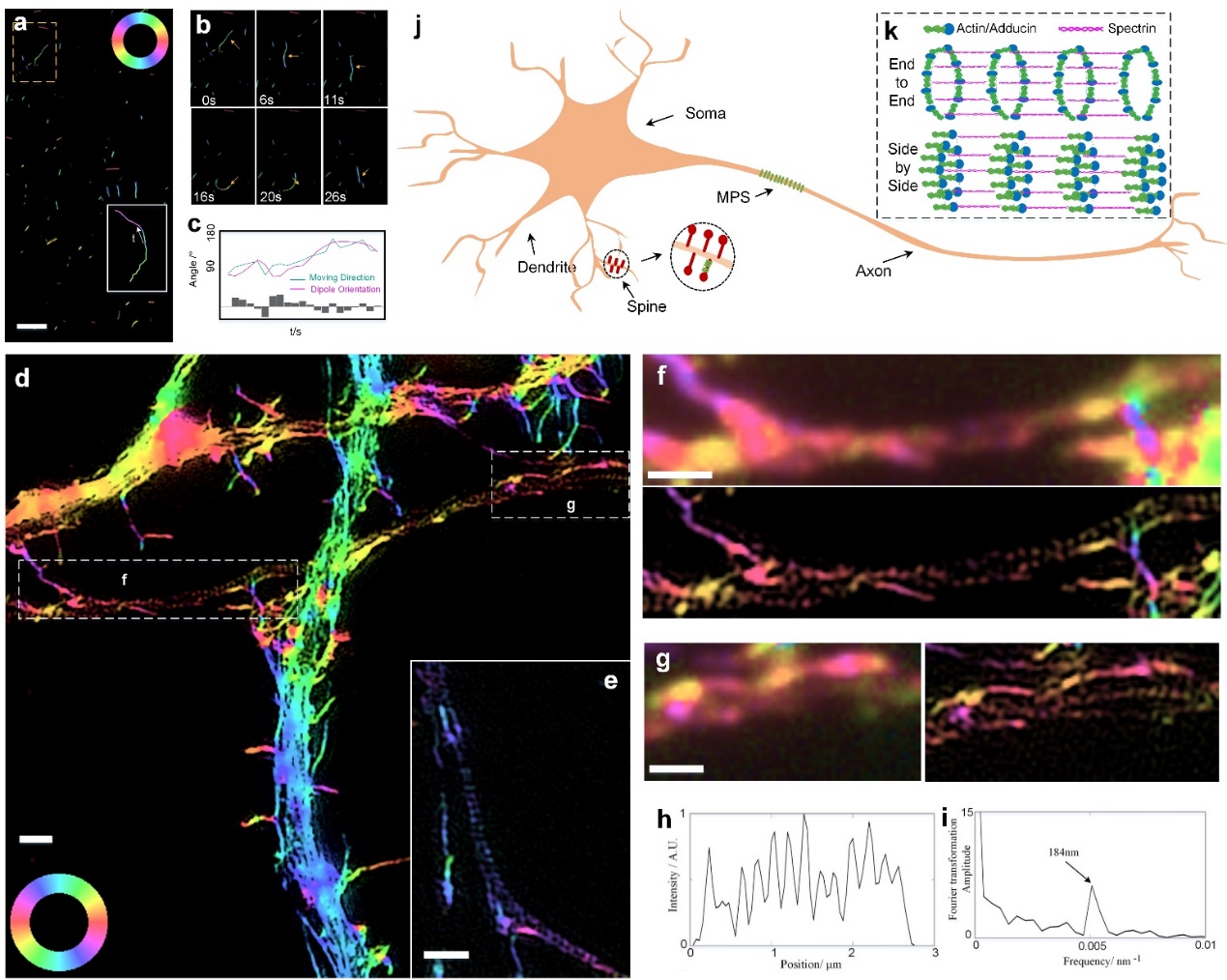 为了验证这一技术与SIM的广泛兼容特性,研究人员测试了多种商用SIM系统及自主搭建的SIM平台,以及2D-SIM、3D-SIM、TIRF-SIM成像能力,成功提取荧光分子的偶极子方位信息与超分辨结构信息。他们进行了大量的生物学实验来证明其广泛的适用性,如λ-DNA、BAPE细胞和小鼠肾组织中的肌动蛋白丝、肌动蛋白和肌球蛋白之间的相互作用,以及中GFP染色的U2OS活细胞微管。研究团队对神经元中的膜相关周期骨架(MPS)进行了研究。pSIM以高的空间分辨率和准确的偏振检测,揭示了肌动蛋白环在MPS中“并排”组装的新模型,推翻了以往教科书上肌动蛋白环“端到端”的结构假设。pSIM具有高的时空分辨率和独特的偶极子方向信息,在未来解决各种生物问题方面具有广阔的应用前景。