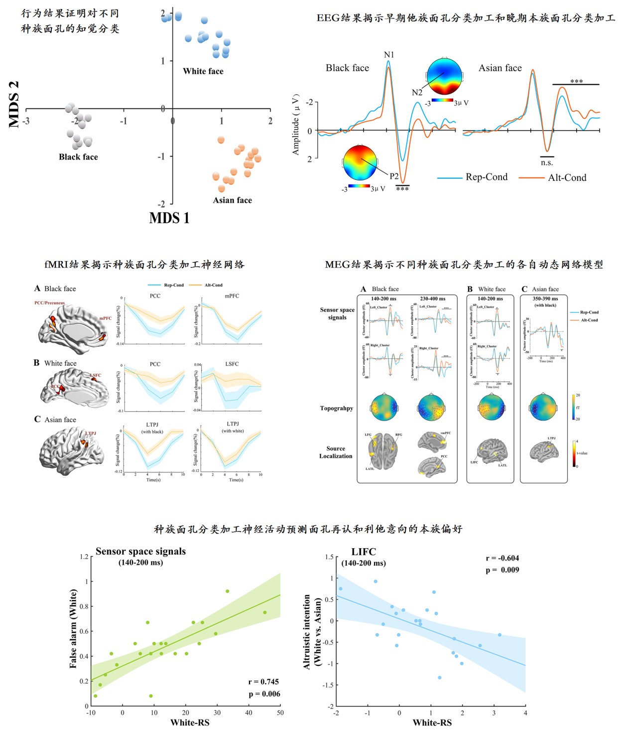 把不同的个体归类为同一个种族,以此为基础在态度和行为上区别对待他族和本族成员,这种现象在人类社会广泛存在并产生严重后果,因此受到心理学、神经科学等多个领域的高度关注。北京大学心理与认知科学学院及麦戈文脑研究所韩世辉教授课题组率先使用脑成像技术,揭示了痛觉共情活动的种族偏好(Xu et al., 2009, Journal of Neuroscience ),并基于系统研究结果发表了“非对称种族加工模型”(Han, 2018, Trends in Cognitive Sciences ),该模型提出对他族成员的分类加工导致认知和共情种族偏好这一理论假设。10月7日,韩世辉课题组在学术期刊 Nature Human Behaviour 发表了题为“Neural dynamics of racial categorization predicts racial bias in face recognition and altruism”的长篇论文,报告了该课题组最新多模态脑成像(脑电、脑磁及功能磁共振)研究结果,揭示了人类面孔种族分类加工的神经机理及其与面孔再认和利他意向的关系,对自己的理论假设进行系统的心理学和神经科学验证。博士生周雨青是该论文的第一作者,韩世辉是该论文的通讯作者。