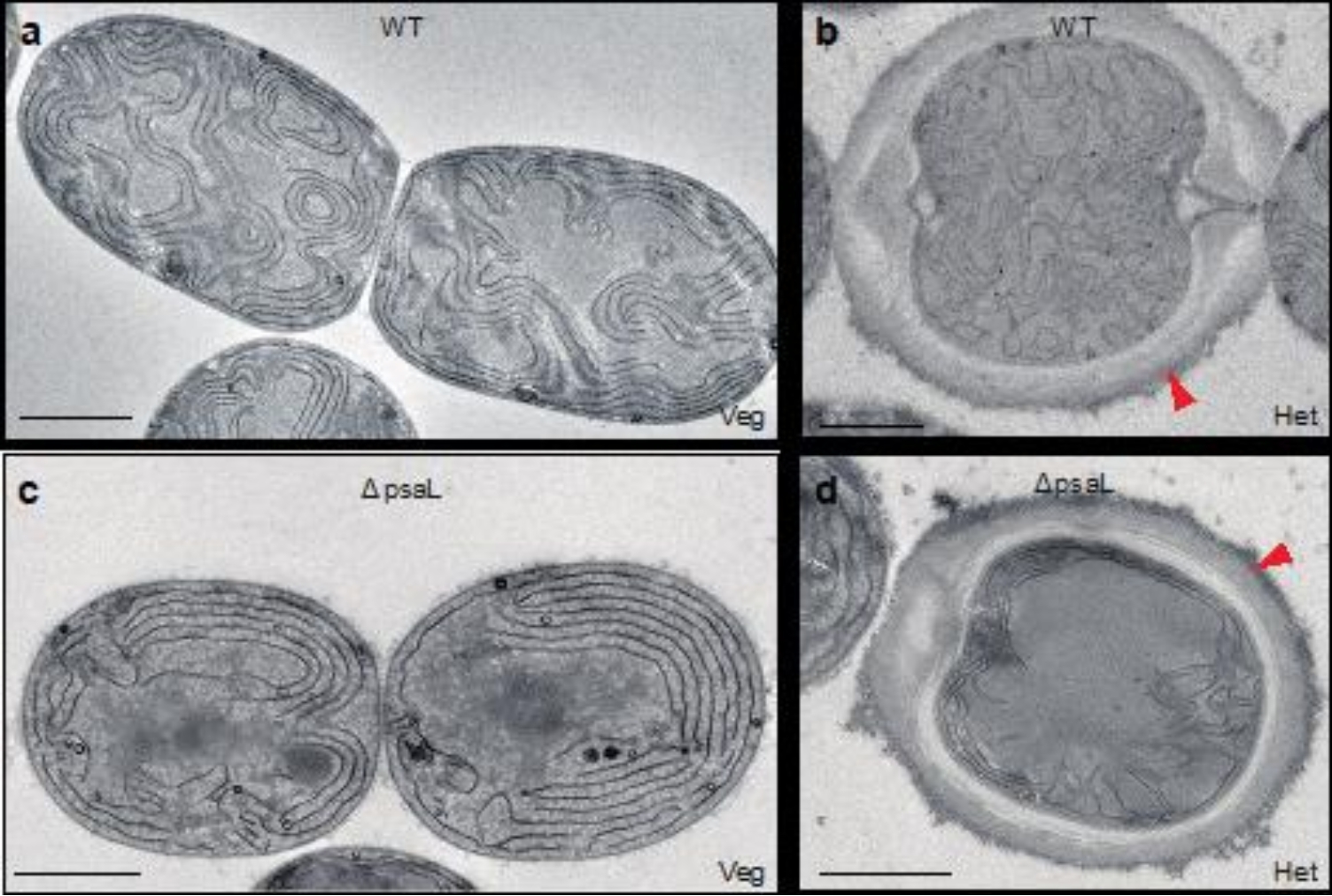 图2: PCC 7120营养细胞(Veg)和异型胞(Het)的类囊体膜组织图。敲除PsaL亚基的两类细胞的类囊体膜都变得更加规则化