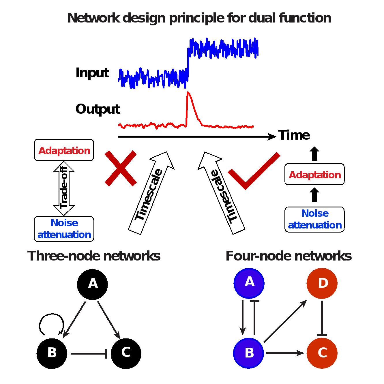 课题组的研究工作鉴定了适应性和抗噪性之间的制约关系,揭示了时间尺度是连接网络拓扑与生物功能的重要桥梁,同时也为其它双功能和多功能网络的设计提供了一种可行的理论框架。