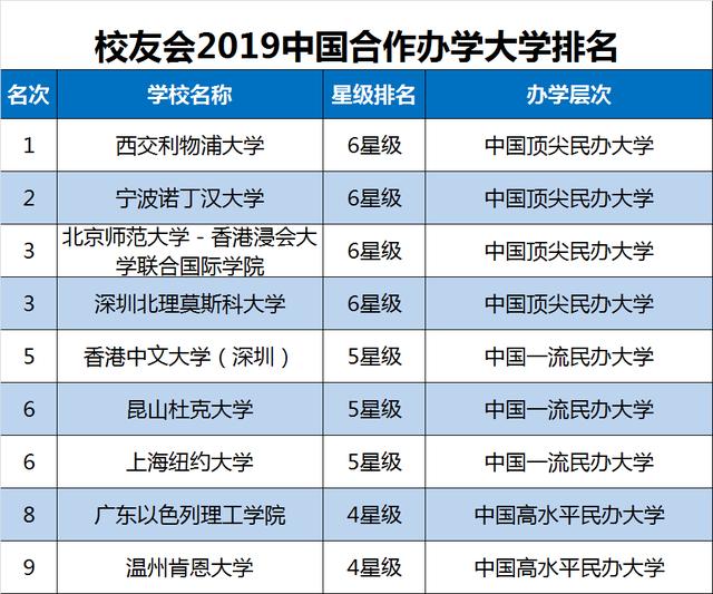 在2019中国合作办学大学排名中,西交利物浦大学第1,宁波诺丁汉大学第2,北京师范大学-香港浸会大学联合国际学院第3,深圳北理莫斯科大学第4,香港中文大学(深圳)第5,昆山杜克大学和上海纽约大学并列第6,广东以色列理工学院第8,温州肯恩大学第9。