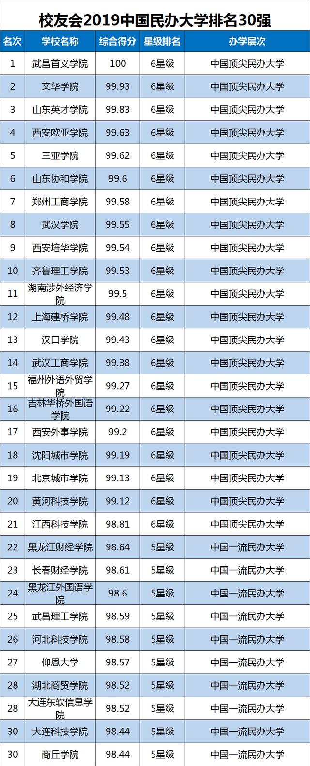 报告显示,在最新校友会2019中国大学排名中,武昌首义学院综合实力最强,问鼎2019中国民办大学排名冠军,文华学院第2,山东英才学院第3,西安欧亚学院第4,三亚学院第5,山东协和学院第6,郑州工商学院第7,武汉学院第8,西安培华学院第9,齐鲁理工学院第10。
