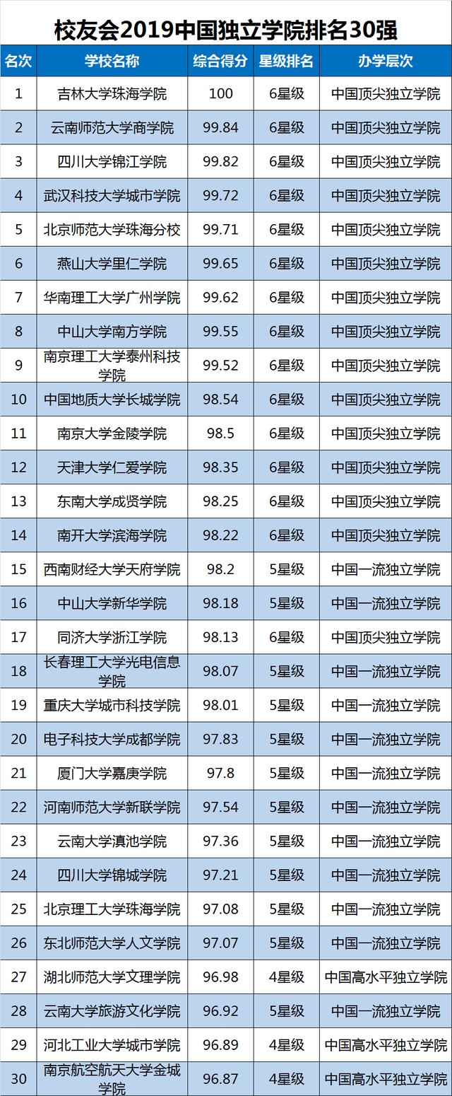 榜单显示,吉林大学珠海学院办学实力最强,雄居校友会2019中国独立学院排名首位,云南师范大学商学院第2,四川大学锦江学院第3,武汉科技大学城市学院第4,北京师范大学珠海分校第5,燕山大学里仁学院第6,华南理工大学广州学院第7,中山大学南方学院第8,南京理工大学泰州科技学院第9,中国地质大学长城学院第10。