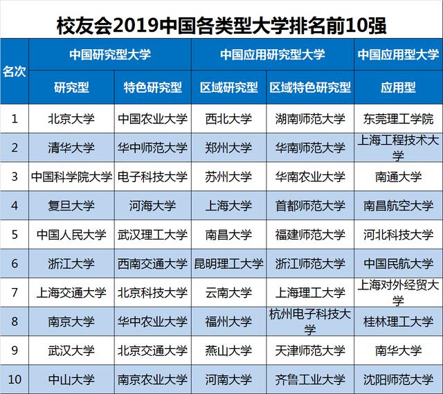 按照最新校友会2019中国大学分类体系标准,将中国高校划分为研究型(中国研究型和特色研究型)、应用研究型(区域研究型和区域特色研究型)、应用型和技术型等4种类型。报告显示,北京大学、清华大学、中国科学院大学、复旦大学、中国人民大学和浙江大学雄居2019中国研究型大学排名前5强。西北大学、郑州大学、苏州大学、湖南师范大学和上海大学名列2019中国应用研究型大学排名前5强。东莞理工学院、上海工程技术大学、南通大学、南昌航空大学和河北科技大学名列2019中国应用型大学排名前5强。