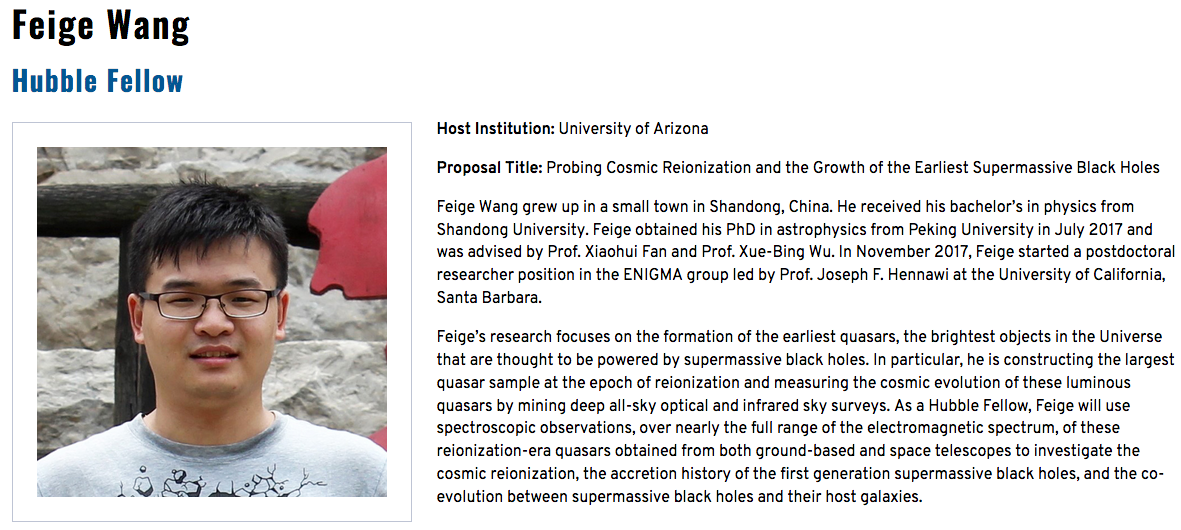 Hubble Fellow是国际天文界最具声望的博士后奖励,获奖者可在美国自由选择合作单位从事博士后研究,由美国宇航局提供全额工资和研究经费,因此竞争尤为激烈。中国大学培养的博士毕业生中, 迄今只有两位获得此荣誉,而且两位均毕业于北大物理学院天文学系,即2017年入选的徐思遥和2019年入选的王飞格。