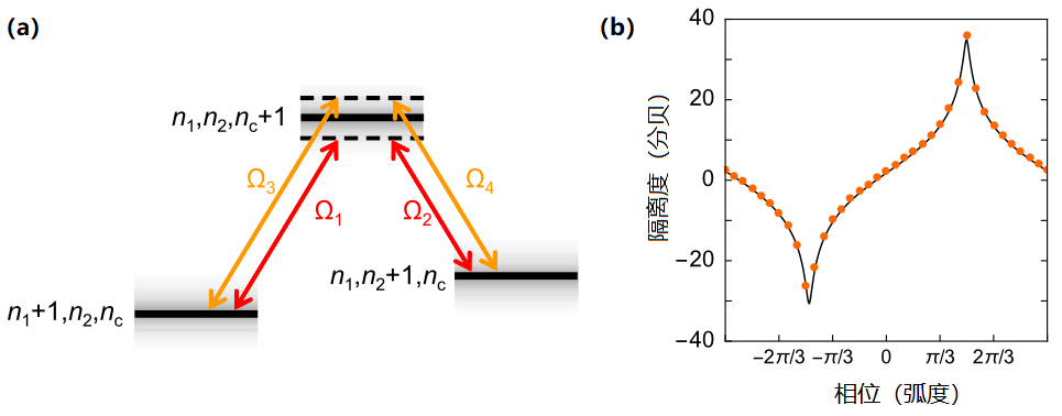 (a)基于光力相互作用的非互易声子耦合机制。(b)通过控制激光相位,声子隔离度±30分贝连续可调