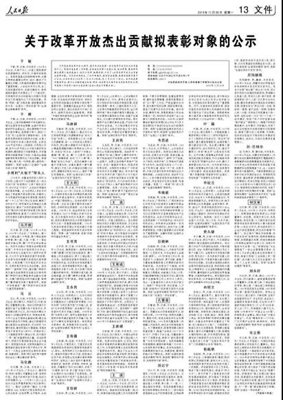 今天,中央庆祝改革开放40周年表彰工作领导小组办公室,通过《人民日报》公示了一份重磅名单——为庆祝改革开放40周年,党中央决定表彰一批为改革开放作出杰出贡献的个人。