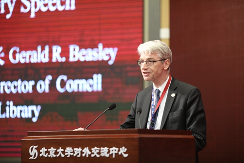 康奈尔大学图书馆馆长杰拉尔德•比斯利(Gerald R. Beasley)首先表达了对北大图书馆建馆120周年的祝贺。在谈到图书馆如何应对信息技术飞速发展所带来的挑战时,他提出了三个问题:图书馆如何更好地服务于学校、图书馆技术如何更好地服务于用户、图书馆如何才能应对挑战再创辉煌。杰拉尔德•比斯利认为,在人工智能、大数据等技术的挑战下,图书馆不仅要收藏和管理信息资源,更要注重提供知识管理并提升用户信息素养。