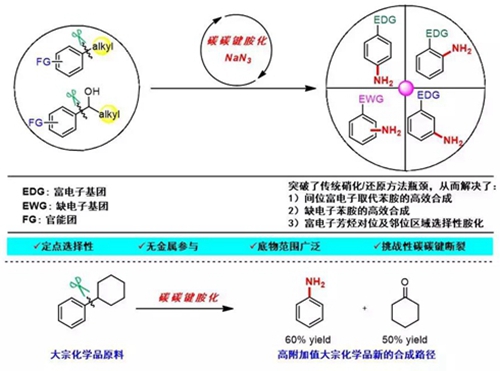 2018年10月29日,国际著名学术期刊Nature Chemistry在线刊登了北京大学天然及仿生药物国家重点实验室焦宁教授研究团队题为“From Alkylarenes to Anilines via Site-Directed Carbon-Carbon Amination”的突破性成果。该研究开发了芳烃类大宗化工原料的新用途,通过惰性的碳碳键转化为苯胺类化合物的制备提供了新的合成思路,有望为医药、材料等领域重要的基础原料芳胺及环己酮的制备提供新策略、新工艺。