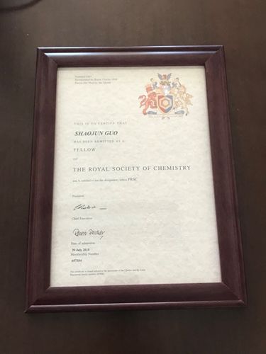 日前,北京大学工学院郭少军老师收到英国皇家化学学会颁发的证书,当选为英国皇家化学学会会士(Fellow of the Royal Society of Chemistry,FRSC)。