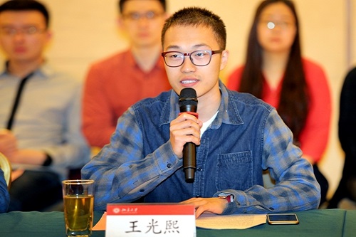 北京大学第三十二期团校学员代表、对外汉语教育学院2014级硕士研究生邢思,结合她参加高团活动后对北大精神的深入思考,谈到“北大师生始终与祖国和人民共命运、与时代和社会同前进”;即将参军入伍的医学部国防生、第十届“学生五?四奖章”获得者王光熙,用朴实真切的语言讲述了他的医学科研经历和总书记重要讲话对自己产生的深远影响,他将牢记五四精神,在人民最需要的地方奉献自我;第十八届研究生支教团成员、法学院2012级本科生高赫聪,动情讲述了自己作为少数民族传承人培养计划的成员,前往相对落后的少数民族聚居地开展教育实践活动的难忘经历,她将前往乌鲁木齐进行为期一年的支教工作,并立志成为一个值得信赖的、能够为他人和公共利益而奋斗的北大青年;第五届学生十佳党支部书记、政府管理学院2013级本科生邹瑞阳,从学习、创新、实践和服务等党支部建设的四个维度,与在场师生分享了自己对基层党建和青年党员成长成才的思考与体会,认为学生党员应当也必须是青年队伍中的先锋,需要承担特殊的责任和使命,引领广大青年贡献青春正能量;北京大学生命科学学院研究员、青年千人计划入选者伊成器,从时代的机遇、脚踏实地的信念和创新的信心三个角度分享了自己学成回国后的感想与体会,表达对母校与祖国关怀培养青年知识分子的感谢与敬意;对外交流中心青年职工刘晓娜介绍了在平凡岗位与团队一起努力承担幕后工作的经历,表达始终坚持践行爱岗敬业、立足本职、拼搏奋斗、奉献青春的五四精神。