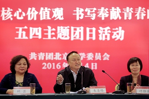2016年5月4日,正值五四运动97周年纪念日,同时也是北京大学118周年华诞。当天上午,共青团北京大学委员会在英杰交流中心举行“践行社会主义核心价值观,书写奉献青春的时代篇章”五四主题团日活动。北京大学党委书记朱善璐,医学部党委副书记顾芸,党委办公室校长办公室主任郭海、副主任胡少诚,学生工作部部长张庆东,党委组织部副部长柴真,党委宣传部副部长于晓凤,后勤党委书记、总务部副部长刘宝栓,团委书记陈永利,医学部团委书记沈鹏出席活动。院系青年教师和学生代表、团委机关干部、北大团校学员以及青年职工代表等200余人参加活动。活动由校党委副书记叶静漪主持。