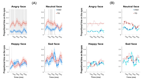 为了探究孤独症眼睛回避的机制,易莉课题组以2-5岁的孤独症儿童为研究对象,探究了这个年龄段的孤独症儿童异常的面孔加工模式,特别是眼睛回避的程度是否受到威胁性面孔表情的调节。该研究采用眼动追踪技术记录了孤独症和正常发展儿童在观察生气、悲伤、高兴和中性表情面孔时的眼动数据。对总体的注视时间的分析发现,孤独症儿童主要回避看生气面孔的眼睛。进一步分析发现,相比于正性表情(高兴),正常发展儿童更多看负性表情(生气和悲伤)面孔的眼睛,提示了正常儿童对情绪信息的敏感;而孤独症儿童却更少看生气面孔的眼睛,表现出特异于威胁性面孔的眼睛回避。同时,他们看生气面孔的时间却又长于其他表情面孔。这种非典型性的注视模式可能反映了他们对威胁性面孔的警觉以及对面孔最具威胁性区域——眼睛的回避。这种警觉-回避模式不仅能使他们时刻关注威胁性源头的动向,也能减轻眼睛接触带来的不适感。该研究还用新异的时程分析和变点分析等方法进一步揭示了孤独症儿童异常的情绪面孔加工模式(如图)。对于生气面孔,孤独症孩子表现出持续的眼睛回避,说明他们无法适应生气面孔的威胁性。对于威胁性稍弱的中性表情面孔,孤独症孩子的眼睛回避现象主要出现在面孔加工的前期。随着时间的进行,他们看眼睛逐渐增多,可能反映他们逐渐适应了中性面孔的威胁性。本研究结果支持并拓展了眼睛厌恶假说,说明该年龄段的孤独症儿童对眼睛特别是威胁性面孔眼睛存在厌恶感,引起他们的生理唤起以及不适感。为了降低不适感,他们选择回避看这些表情面孔的眼睛。该研究不仅为理解孤独症儿童眼睛回避的内在机制提供了新思路,也为设计提高孤独症儿童眼睛接触的干预方案指明了新的方向。