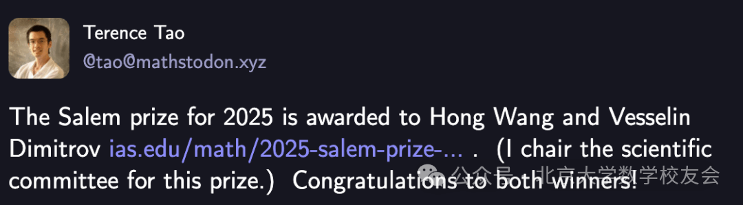 近日,北大数学07级本科校友王虹获得2025塞勒姆奖,以表彰其在调和分析和几何测度论领域解决一系列重要开放问题中所作的贡献。
