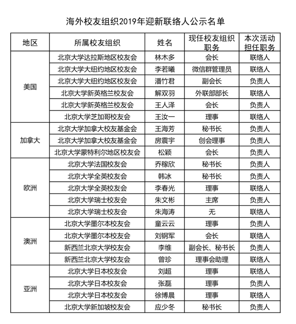 根据《关于开展2019年毕业季“北大毕业生微信群”活动的通知》,自2019年6月18日至6月28日,北京大学校友会、校友工作办公室向各备案校友组织征集对接2019年毕业生校友组织联络人。为了保证联络人有效性,请各备案校友组织做好核实、监督工作。现将校友组织联络人报名名单公示如下(详见附件),公示期为2019年6月28日至7月4日。