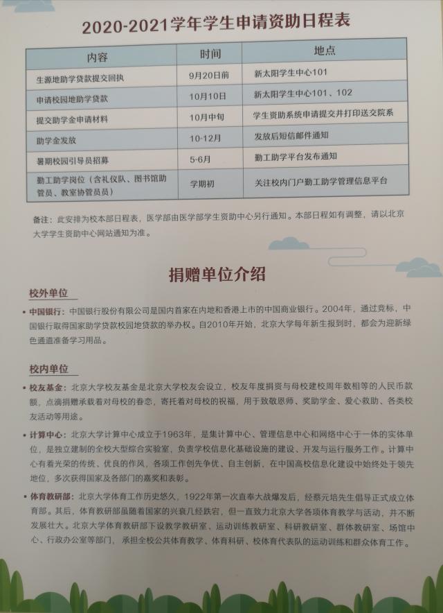 2020年9月,北京大学迎新绿色通道迎来2020级新生。新生在绿色通道现场可以领取爱心大礼包,发放的这些爱心礼包由北京大学校友基金资助,礼包包含30余样学习、生活用品,可以满足新生的基本生活需求。