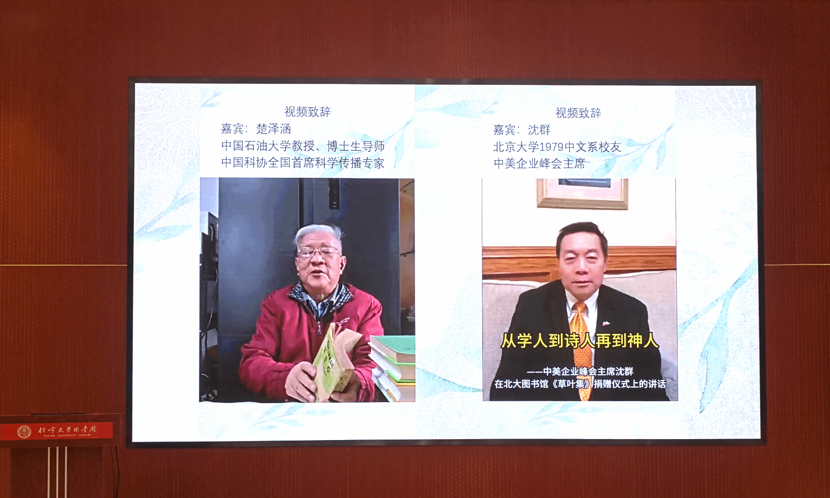 两位未到场的嘉宾通过视频介绍了《草叶集》的故事。首部中译本《草叶集》译者楚图南之子楚泽涵在视频中详细介绍了《草叶集》在中国的出版历程并高度评价了李印白的译本风格。北大1979级中国语言文学系校友沈群回忆了与李印白从诗歌到事业的情谊。活动现场还邀请到多位嘉宾从不同维度解读《草叶集》的魅力。李印白与李晓峰、施坚、王婧围绕《草叶集》与惠特曼、《草叶集》与摄影、《草叶集》与北大等主题展开对谈。