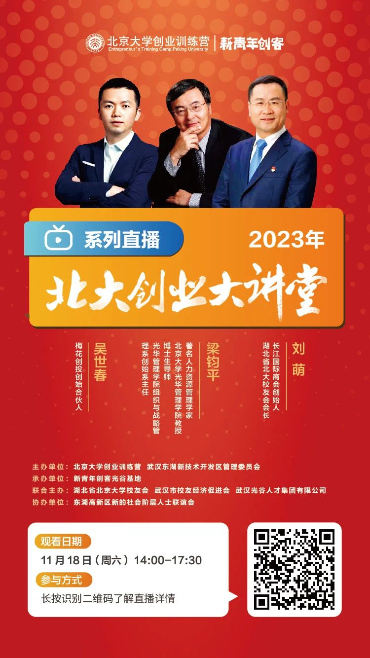 2023年11月18日,“北大创业大讲堂”即将亮相武汉光谷,各位企业家/创业者与嘉宾导师一起解码制造产业和战略性新兴产业的发展趋势,开展深度研讨并拓展广泛合作,同时搭建项目与政策、资本之间的沟通交流平台,赋能企业高质量发展。