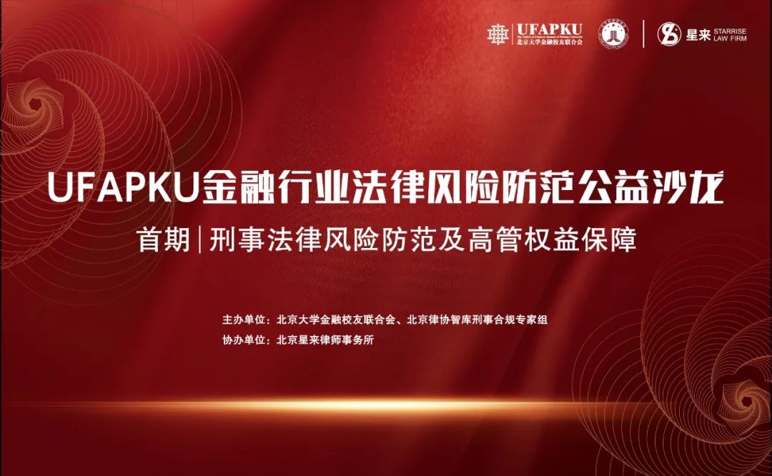 近年来,金融领域创新活跃,但伴随而来的法律风险值得关注;监管层出手打击市场违法违规行为的动作愈加频繁,惩罚力度也呈加大趋势。如何控制合规风险,怎样加快建设法律合规风控管理体系,哪些措施才能守住企业的“生命线”……针对以上行业痛点问题,北京大学金融校友联合会携手北京律协智库刑事合规专家组、北京星来律师事务所,共同策划了UFAPKU金融行业法律风险防范公益沙龙系列活动,邀请重量级嘉宾分享行业洞察,并提出建设性建议,为各位金融北大人排忧解难,为公司经营拓展新思路。